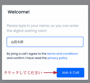 3. 画面にお名前が表示されます。英語で書かれた [Join a Call] をクリックしてください。