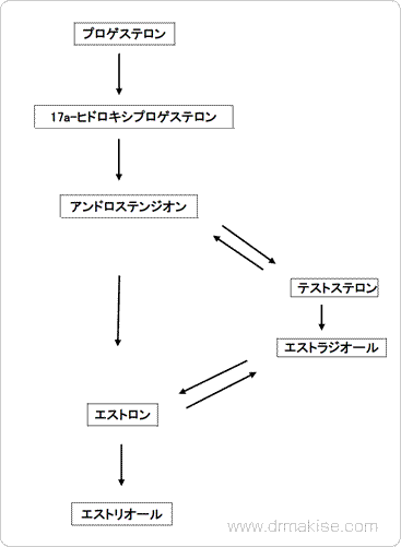 更年期障害のひどい女性が日本よりはるかに多いアメリカでは、ヒトのプロゲステロンとまったく同じ構造のプロゲステロン(これを bio-identical progesterone と呼びます) を含むクリームをつくり、それを皮膚から吸収させるよう、代替療法を行う医者たちは、患者さんにすすめています。 図を見るとおわかりのように、プロゲステロンからエストロゲン(エストロン、エストラジオール、エストリオール)が代謝されてきます。