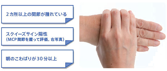 MCP関節を握り(写真)、患者が痛みを訴えれば、スクイーズサイン陽性と評価する。3項目のうち2項目当てはまれば、関節リウマチの可能性が高い。