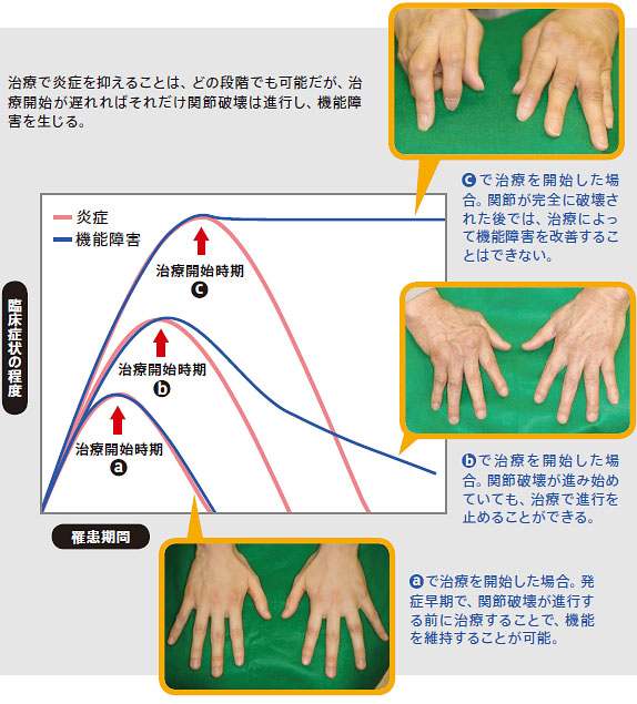下の図を見てください。早期に治療を始めなければ、関節破壊がおこります。そして、いったん変形がおこれば、今の医学ではもとにもどせないのです。