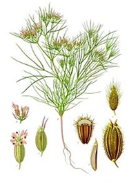 このオイルは中近東で、健康増進のために非常によく飲まれているオイルです。原料となるクミンはエジプトなどを原産とするセリ科の一年草で、和名はウマゼリ(馬芹)です。その種子から抽出したオイルで、「死以外は、何にでも効く」とまで重宝がれており、古代エジプト第18王朝ツタンカーメンの時代(紀元前14世紀)にさえ、使われていた痕跡があります。
