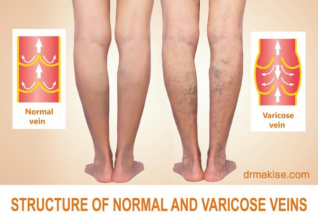 特に女性に多く、立ち仕事に従事する人がかかりやすいのですが、もちろん男性患者さんもおられます。原因は静脈の弁がうまく機能せず、右図のように血液が逆流して滞り、脚の静脈にたまることによります。(左図の静脈は正常です)。