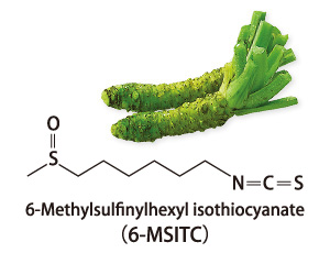 ワサビは寿司に使われるために、今では、”wasabi”は英語としても通用します。しかし、ワサビの健康有効成分については、意外と知られていません。本わさび(Wasabia japonica)の独特な辛味の成分である「6-メチルスルフィニルヘキシルイソチオシアネート(6-MSITC)」は、本わさび特有の成分として知られています。この成分には多様な健康増進作用があるのです。